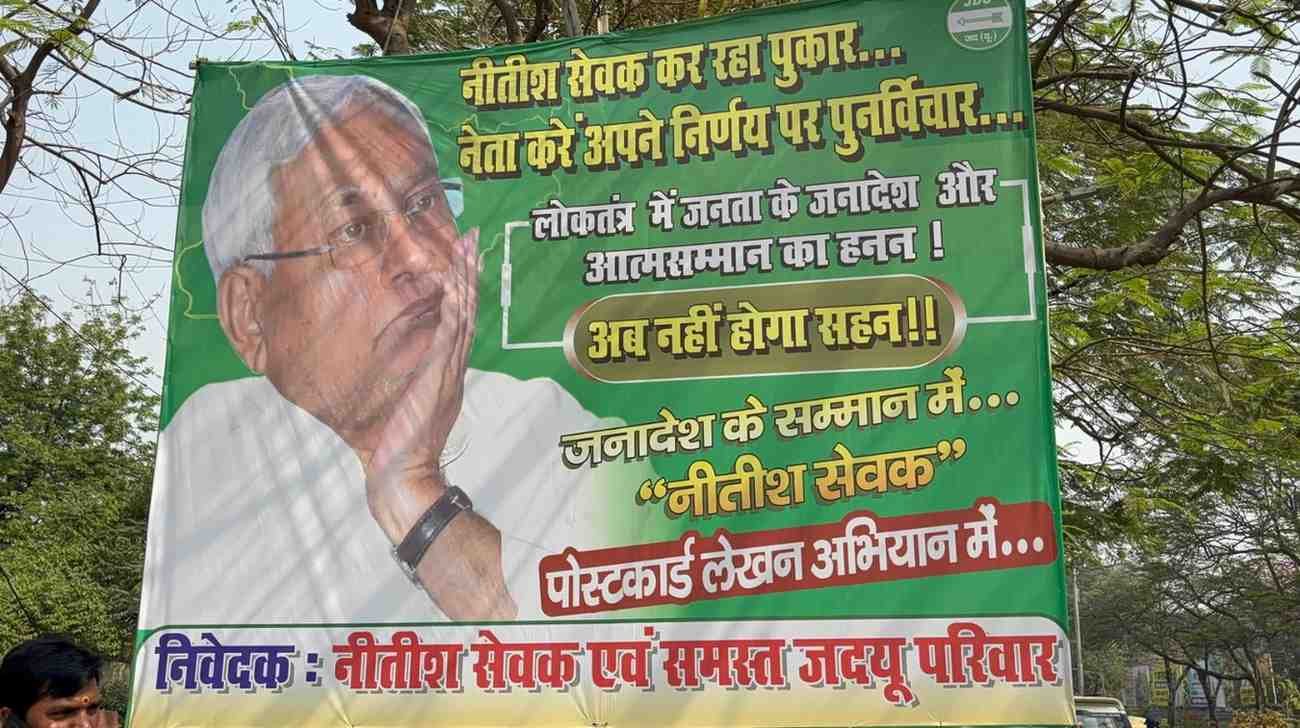 जेडीयू कार्यालय के बाहर बड़े-बड़े पोस्टर लगाए गए हैं, जिनमें नीतीश कुमार से अपने फैसले पर फिर से विचार करने की भावुक अपील की गई है। समर्थकों का कहना है कि यह फैसला न केवल पार्टी के खिलाफ है, बल्कि बिहार की जनता के उस जनादेश और आत्मसम्मान का भी हनन है, जो उन्होंने नीतीश कुमार को मुख्यमंत्री बनाने के लिए दिया था। पोस्टरों के जरिए यह संदेश दिया जा रहा है कि लोकतंत्र में जनता की आवाज सर्वोपरि होनी चाहिए।