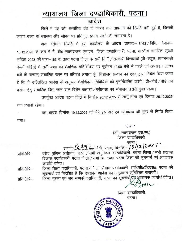 पटना में बढ़ती ठंड और शीतलहर को देखते हुए जिलाधिकारी डॉ. त्यागराजन एस.एम. ने सभी सरकारी और निजी स्कूलों की टाइमिंग बदल दी है। सुबह 10 बजे से पहले और दोपहर 3:30 बजे के बाद पढ़ाई पर रोक रहेगी। आदेश 20 से 25 दिसंबर तक लागू होगा।
