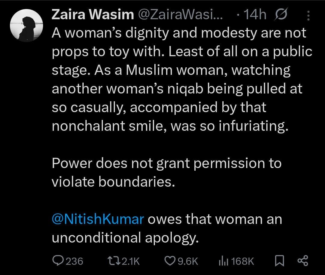 इस पूरे मामले पर अभिनेत्री रह चुकीं जायरा वसीम ने सोशल मीडिया प्लेटफॉर्म X पर प्रतिक्रिया दी है। उन्होंने लिखा कि महिलाओं की गरिमा और मर्यादा किसी के लिए भी मजाक का विषय नहीं हो सकती। एक मुस्लिम महिला के तौर पर किसी दूसरी महिला का हिजाब इस तरह हटाया जाना बेहद अपमानजनक और गुस्से में डालने वाला है। जायरा वसीम ने साफ कहा कि सत्ता में होने का मतलब यह नहीं कि कोई भी व्यक्ति अपनी सीमाएं पार कर सकता है और मुख्यमंत्री को सार्वजनिक रूप से माफी मांगनी चाहिए।